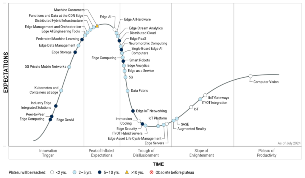 According to Gartner’s 2024 Hype Cycle for Edge Computing, the technology is advancing steadily. As reported, the industry is currently positioned between the Trough of Disillusionment and the Slope of Enlightenment. This means: