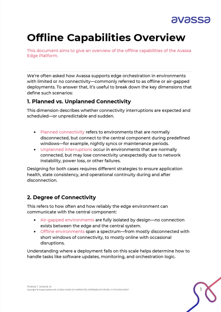 This document aims to give an overview of the offline capabilities of the Avassa Edge Platform.